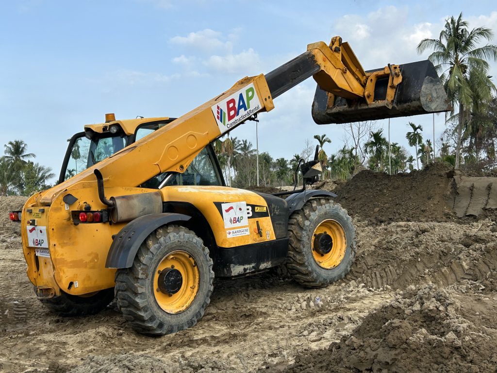 そんな状況だけに、無償貸与されたBAPのテレハンドラー(伸縮式のアームを備えた建機)の活躍は目を引いた。4トンの屈強なボディーが7メートルの力強いアームで次々に土砂を退けていく。テレハンドラーの活躍は住民から大いに感謝された。そのしるしとして、作業員2人が現地の事故防止の祈祷を受けたり、建機の前に集まって写真撮影が行われた。