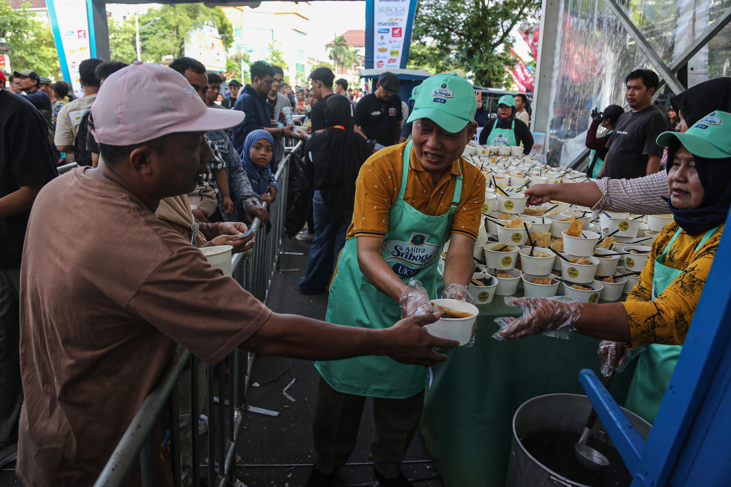 中部ジャワ州スマランのムントゥリ・スペノ通りで1月31日、食品イベント「スリボガ・フェスティバル」がミーアヤム(鶏だし麺)2727食の無料提供で国内記録を達成した。地元の飲食系中小零細事業者の後押しと、人気料理のピーアールが狙い。写真は麺を配る運営スタッフ。