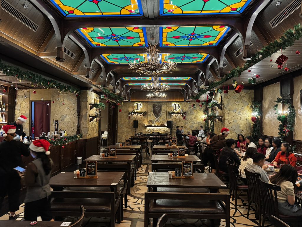 一歩店内に入ると「バイキング」を連想させる、まるで中世の酒場のようなインテリアのレストランが広がっています=②。ビールをジョッキではなく木のコップで飲みたくなりますね。
