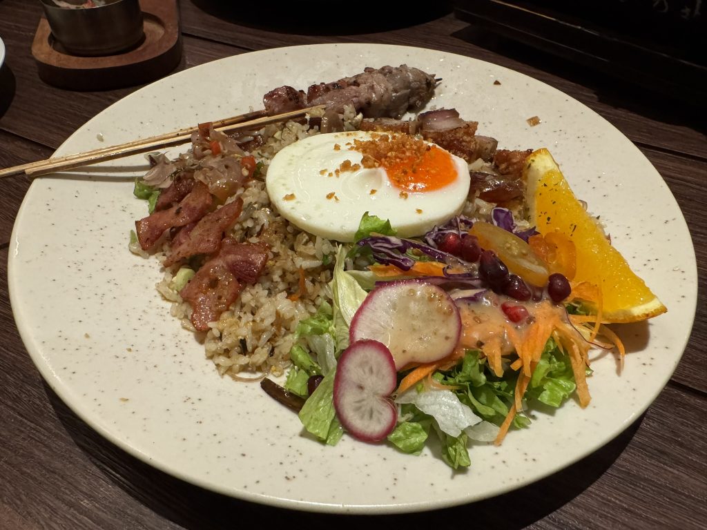 「Nasi Goreng Babi Kecombrang Sambal Matah(ナシゴレン・バビ・クチョンブラン・サンバルマタ)」もなかなか面白い一品です=⑤。クチョンブランは日本の茗荷に近い野菜で、茗荷のようなスッキリした香りが特徴です。豚の油とクチョンブランが出会った時、スプーンが止まらなくなります。さらに甘い味が染み込んだ豚ソーセージの「ラプチョン」も良いアクセントになっています。そこにダメ押しのみんな大好き「サンバルマタ」。間違いのない組み合わせですね。 実際にこちらの料理はお店のベストセラーだそうです。お酒なしで、ランチでこれだけ食べにきてもいいかもしれません。
