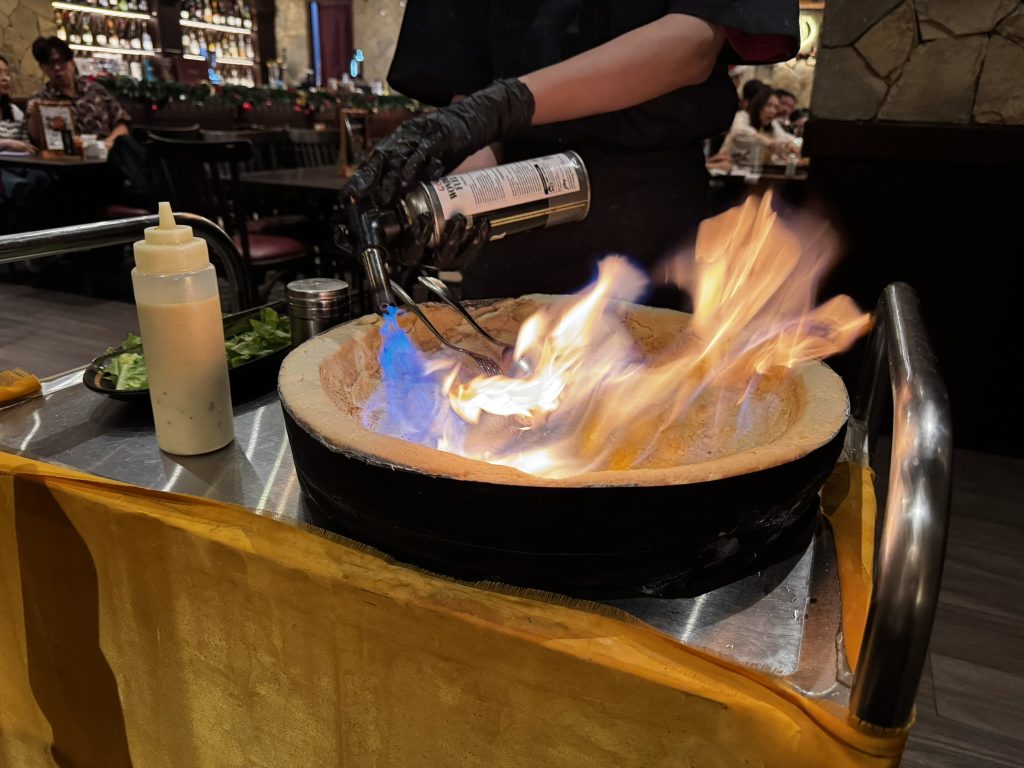 唐突に調理スタッフが巨大なチーズと共に現れるので、何も知らないと「え?こんなチーズなんて頼んでないけど……」とびっくりするかもしれません=⑦。目の前でグラナパダーノチーズと和えながら作ってもらえるシーザーサラダです。チーズだけではなくサラダも目の前で一つずつトッピングして作ってくれます。ライブ感があり気分を盛り上げてくれますね。