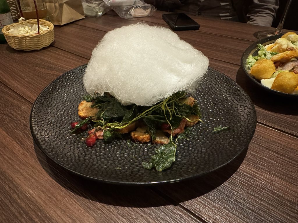ビールのお供にぴったりなカリカリの「Crispy Pork Belly(クリスピーポークベリー)」=⑧ 。お肉の上には綿あめが乗っていますが、こちらは選べるソースのひとつです。今回は写真映えを狙って綿あめを載せてもらいました。これはなかなか面白い味です。塩気のある豚に綿あめも悪くないですね。他にもペリペリソースやチリソース、ソルテッドエッグソースが選べます。本命はおそらくペリペリソースかな?