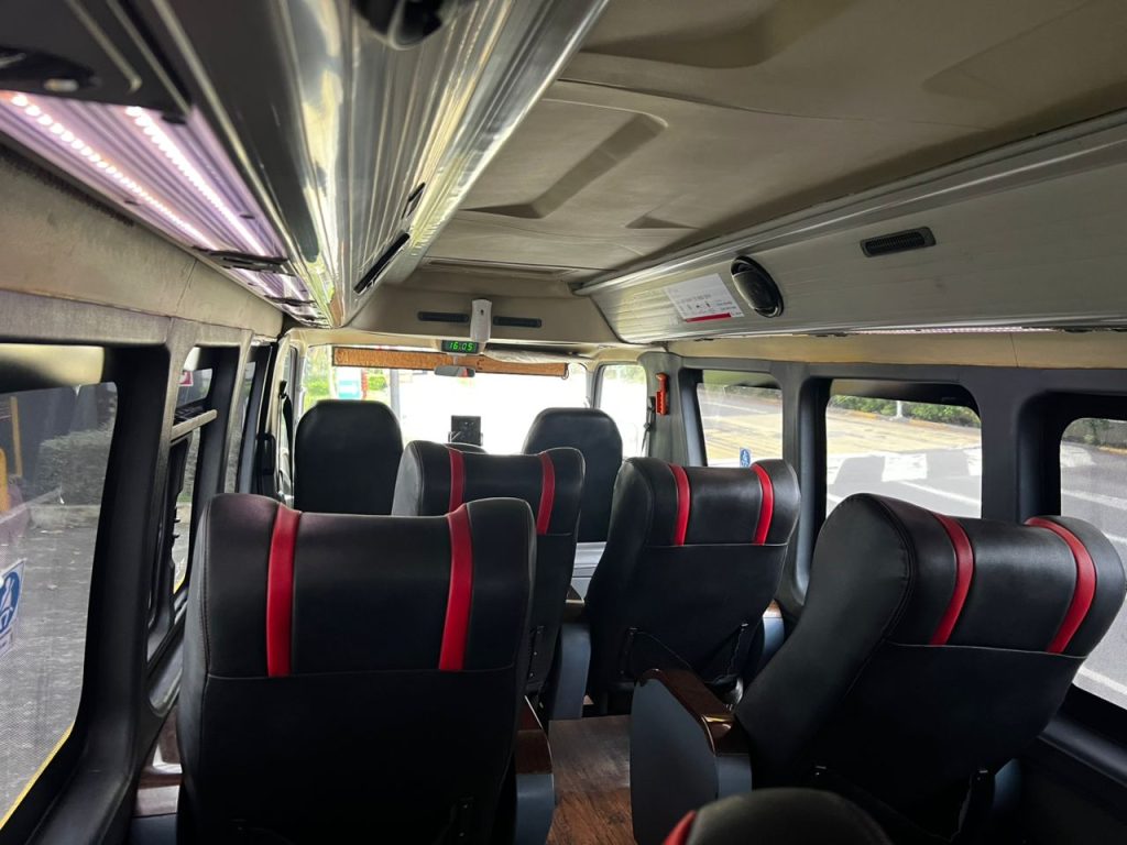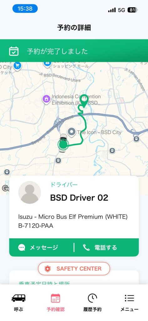 予約後、ほどなくして配車が確定。車両番号やドライバーとの連絡方法が画面に表示された。待つこと数分、白と緑のミニバスが静かに到着した。