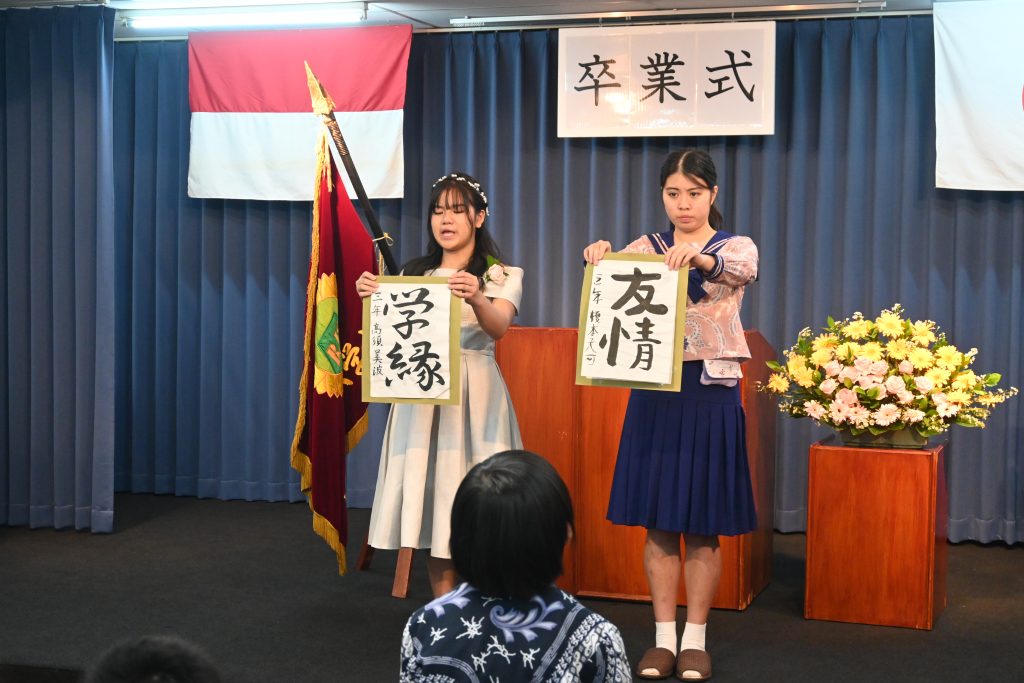 また、中学部の2人は学校生活の思い出を習字で表現。榎本さんは「友情」、髙須さんは「学縁(がくえん)」と記した。髙須さんは「多くの縁に支えられ、ここまで来ることができた。すべての縁に感謝して歩みたい」と決意を語った。