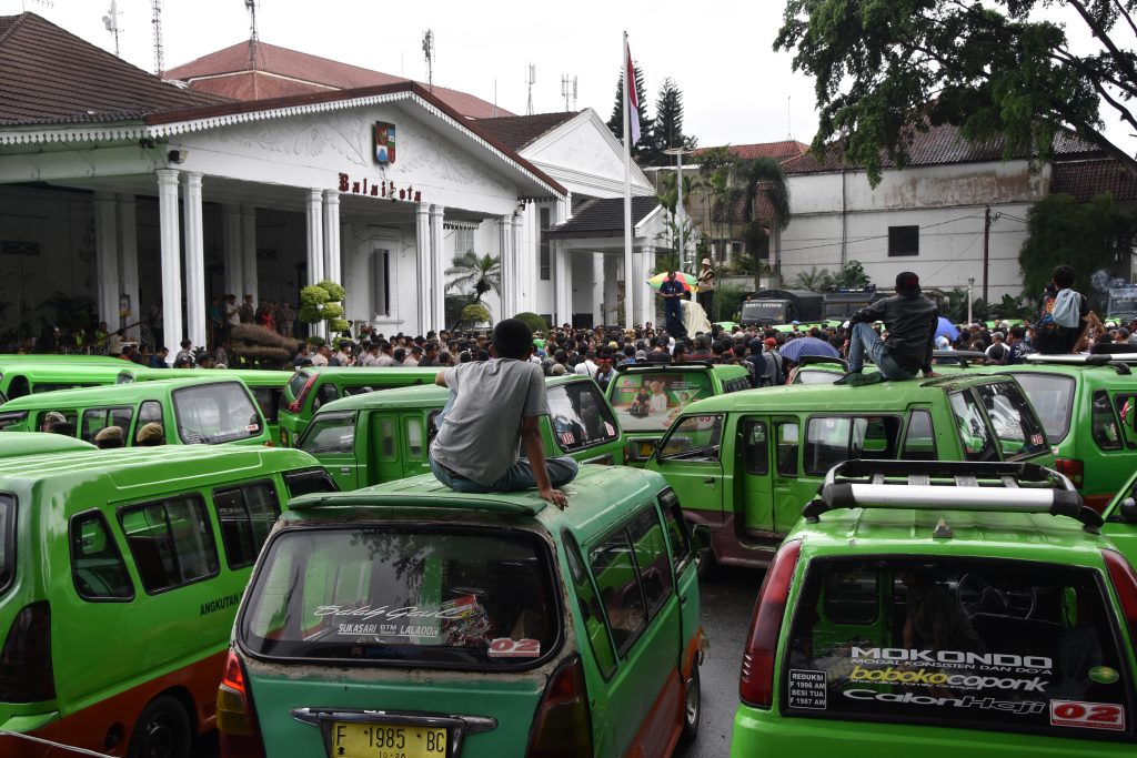 西ジャワ州ボゴール市で22日、乗合小型バス(アンコット)の所有者や運転手からなる団体が市庁舎前で抗議集会を開いた。運転手らは市が進める車齢20年超の老朽車両を段階的に廃止する方針に反対し、生活への影響緩和や代替策の提示を求めた。