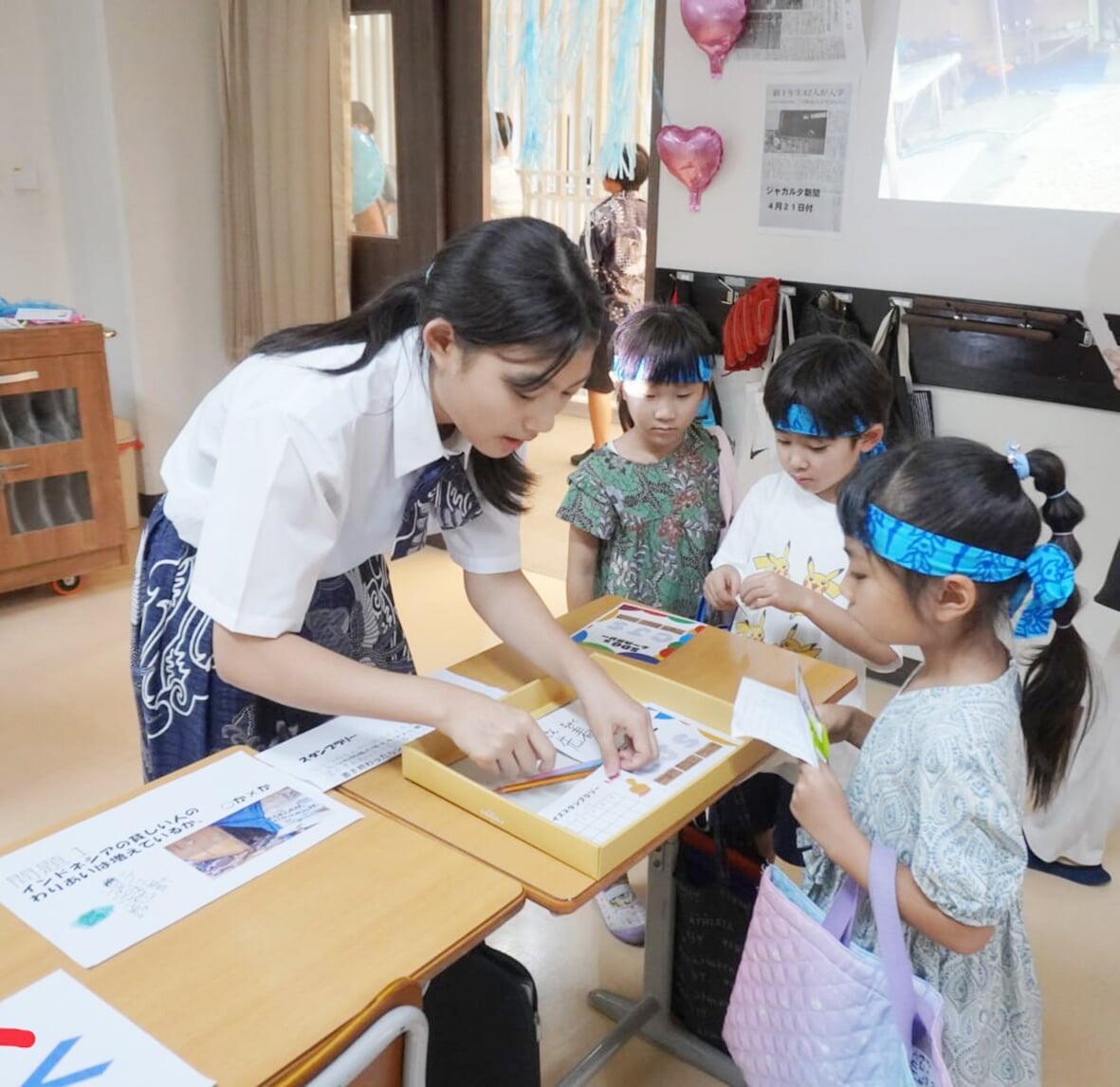 小学部1~6年生は、生活科や総合的な学習の時間、宿泊体験学習や修学旅行などで学んだことを元に、ゲームやクイズ、展示などを行った。4年生では、現地校交流に向けて学んだ日本の伝統遊びを6つのブースで実施。当日、参観したインドネシアの大学生にインドネシア語を使って説明する場面も見られた。