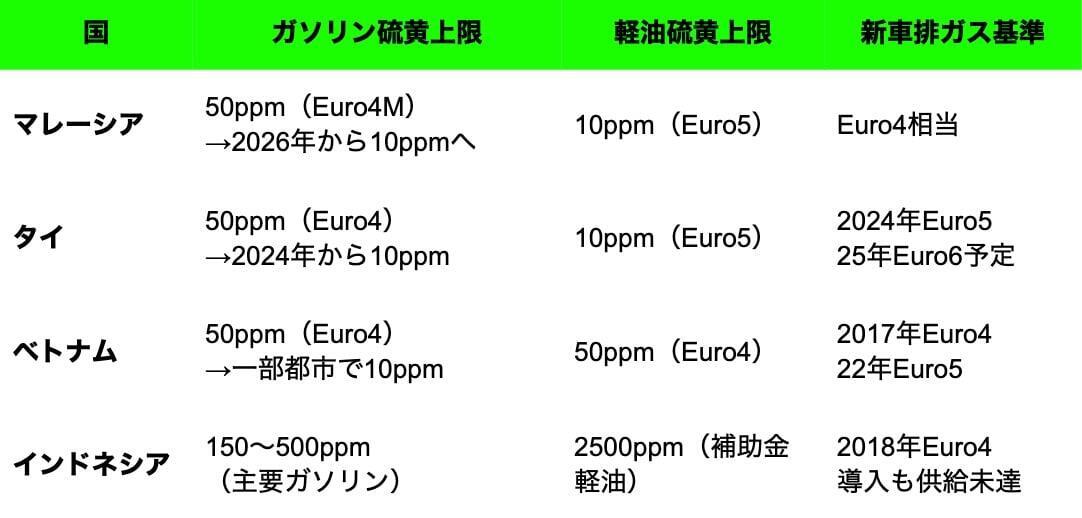 マレーシアはすでに欧州連合(EU)が定めた自動車の排出ガス規制基準のEuro5軽油(硫黄10ppm)を全国導入し、ガソリンも2026年から同水準へ移行する。タイは2012年にEuro4を施行し、2024年にEuro5燃料と車両基準を同時導入予定で、ベトナムも2017年からEuro4、2022年にEuro5を全国適用した。