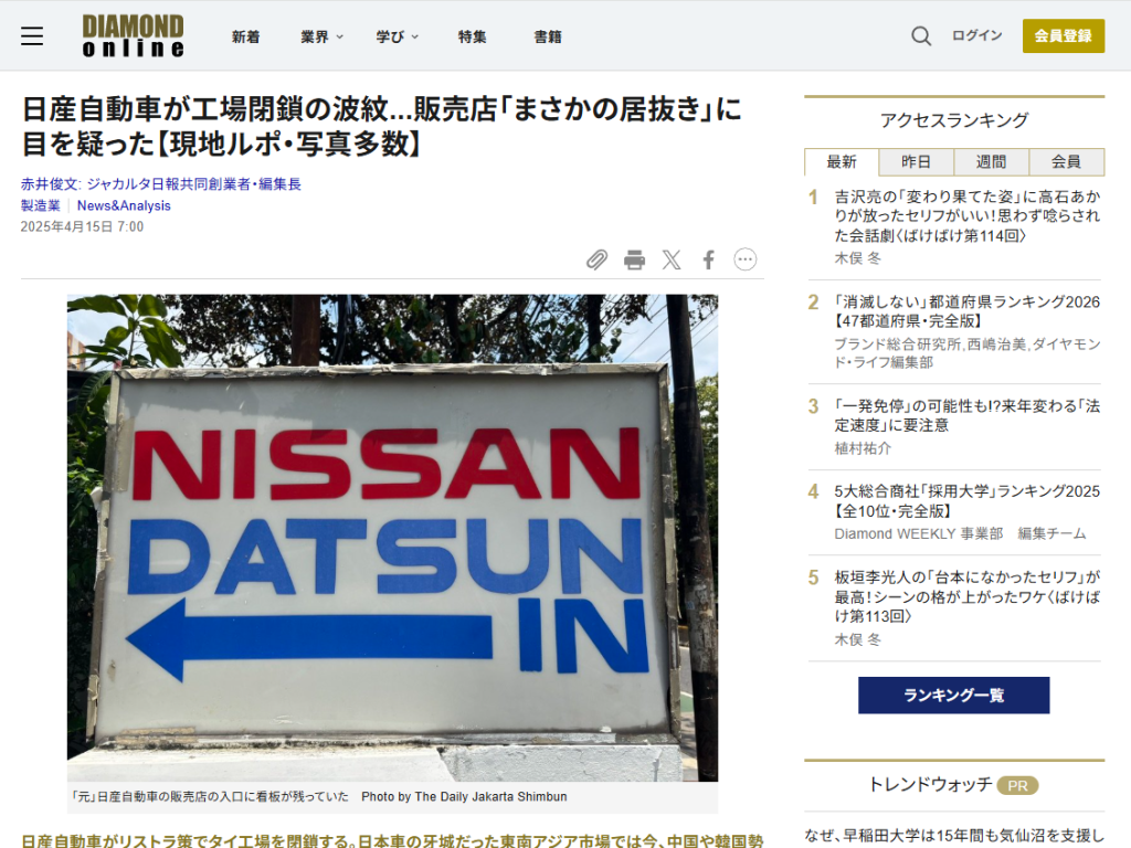 日産がリストラでタイ工場閉鎖へ。東南アジアで中韓・中国勢が攻勢を強め、日本車優位が揺らぐ。日産は20年3月にインドネシア生産撤退。筆者が4月7日に旧販売店を取材すると看板は残るが店内は中国EV「AION」一色。30万人超の既存顧客のアフターサービス維持が焦点。車は最大5億級前後。