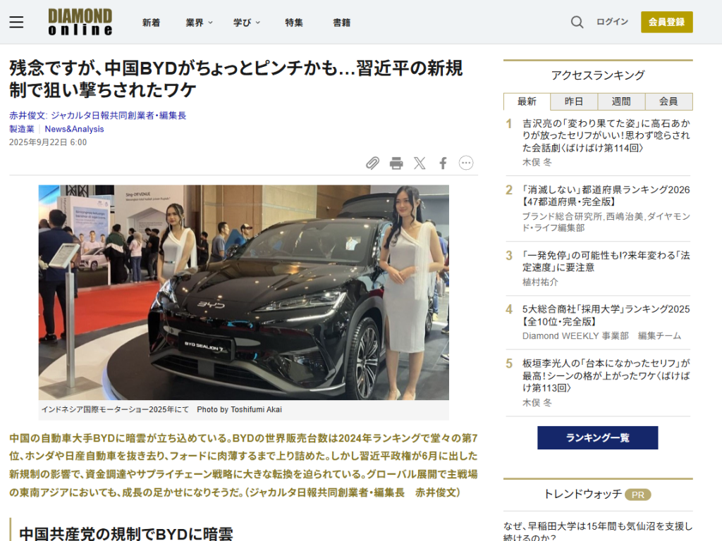 BYDは東南アで工場建設を加速し、タイEV市場で5割超、インドネシアでも新車の約1割がEVでBYDが4割を占める。だが習近平政権の「納品後60日決済」規制で手形依存の資金繰りと値下げ攻勢に陰り。現地計画の混乱や米関税も重なり、24年427万台・25年目標550万台の行方が焦点だ。