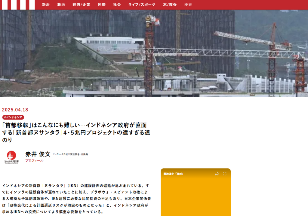 過密化と地盤沈下に直面するジャカルタから、新首都ヌサンタラ(総額約4.5兆円)へ移転する国家計画は、中央官庁移転が「無期限延期」となり足踏み。危機ゆえ撤回も難しい一方、計画を立て直し社会保障と国家戦略を両立できるかが焦点だ。遅れは負担増にもつながり、政権の優先順位が問われるのだ。