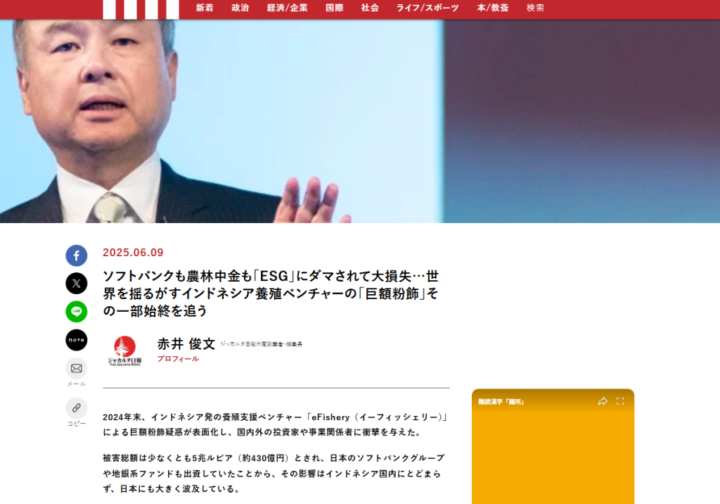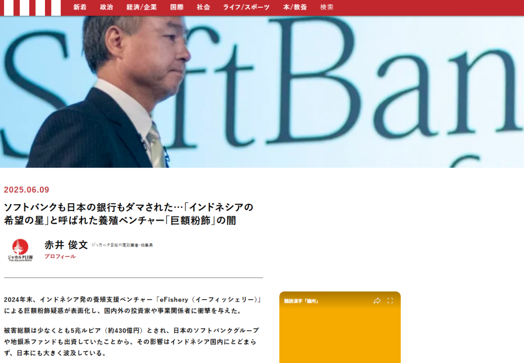 24年末、インドネシア養殖支援ユニコーンeFisheryで粉飾疑惑。外部向けと内部向けで別数字を用意し、売上・取引を水増しした疑い。『養殖DXの星』で資金を集めたが、ソフトバンクや日本の地銀ファンドも巻き込まれ、被害は5兆ルピア規模とされる。創業者は解任、再建と捜査が進行。深刻。