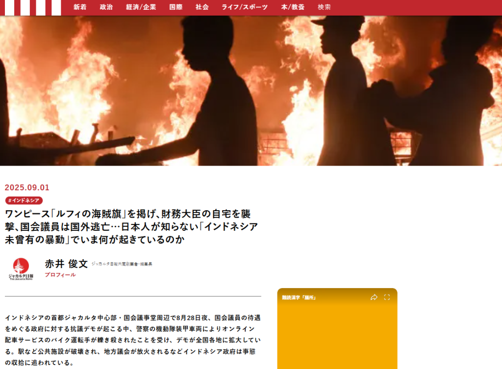 ✎ワンピース「ルフィの海賊旗」を掲げ、財務大臣の自宅を襲撃、国会議員は国外逃亡…日本人が知らない「インドネシア未曾有の暴動」でいま何が起きているのか