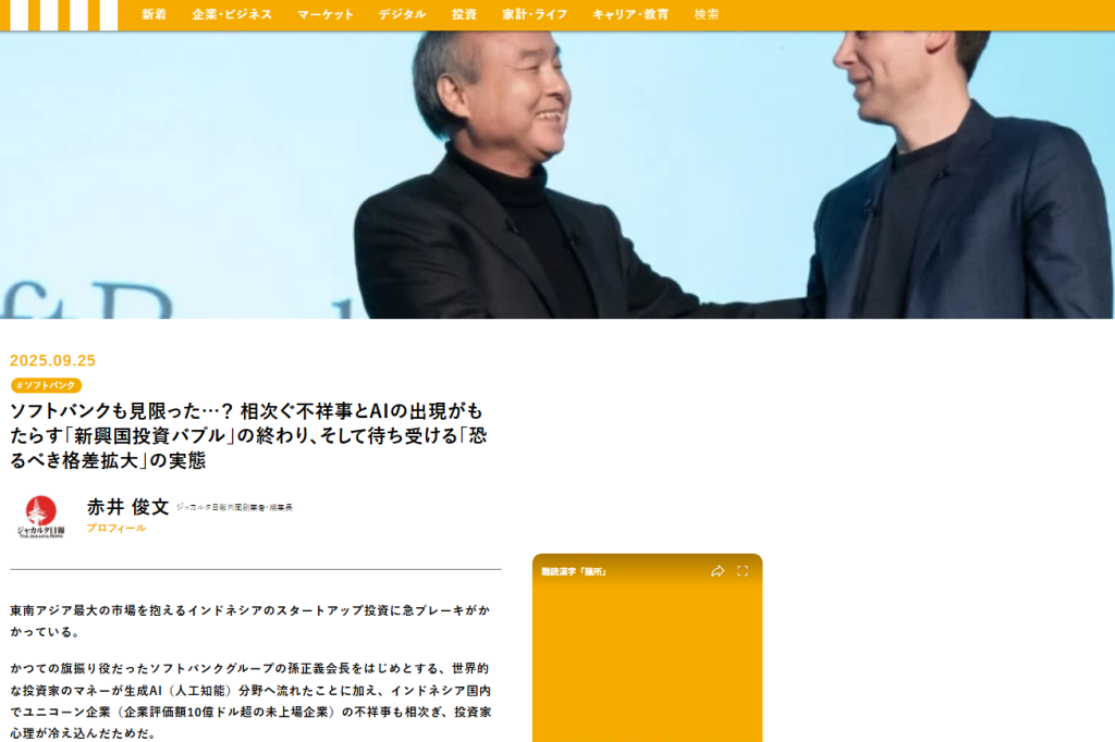 インドネシアのスタートアップ投資が急減速。ソフトバンク系など国際マネーは生成AIへ移り、国内ユニコーン不祥事も重なり投資家心理が冷えた。調達額は24年に前年比66%減とされ、有望企業が育ちにくい。投資バブル終焉は雇用悪化・格差拡大を招き、25年8月末デモにも影を落とす。警鐘鳴る。