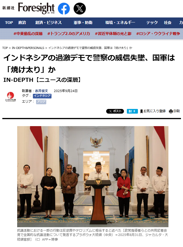インドネシアで8月末、国会議員の住宅手当増額に反発するデモが全国化し一部暴徒化。鎮圧で警察装甲車が配車タクシー運転手を轢死催涙ガス多用も批判。ジョコウィ期に権勢を伸ばした警察の威信が揺らぎ、国軍を母体とするプラボウォ政権で軍の影響力回復論が浮上。大統領は一部行為を反逆罪・テロ視。