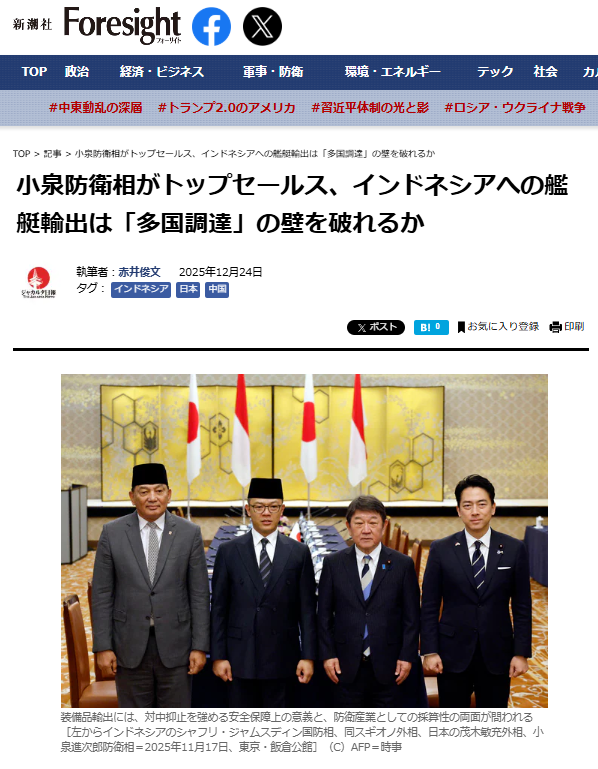 小泉進次郎防衛相はインドネシア国防相を横須賀に招き、護衛艦を売り込んだ。採用なら対中抑止に資するが、同国は多元外交で伊PPAやトルコI級など多国調達を並行し日本は一候補。韓国戦闘機費未払い、中国中古艦検討もあり交渉不透明。装備輸出は抑止と産業採算を同時に問う。防衛産業の試金石だ。